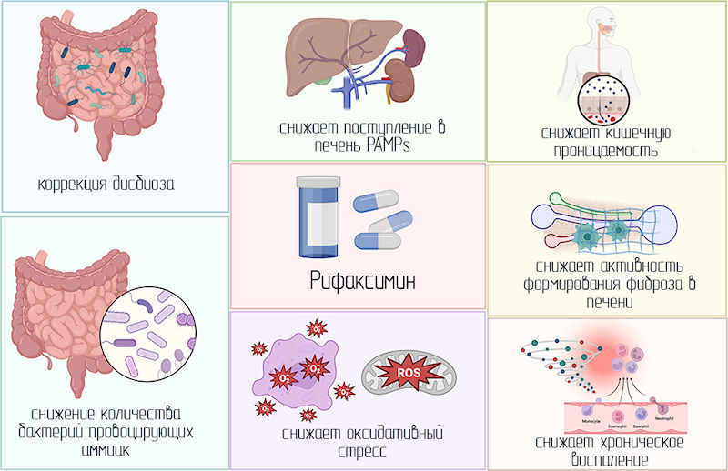 Препаратом выбора для лечения СИБР является Рифаксимин альфа. Рифаксимин — не всасывающийся антибиотик широкого спектра, действующий в просвете кишки. Подавляет грамположительные и грамотрицательные бактерии, включая E. coli, Klebsiella, Proteus. Эффективно справляется с избыточным ростом бактерий при этом не нарушает микробиом толстой кишки.