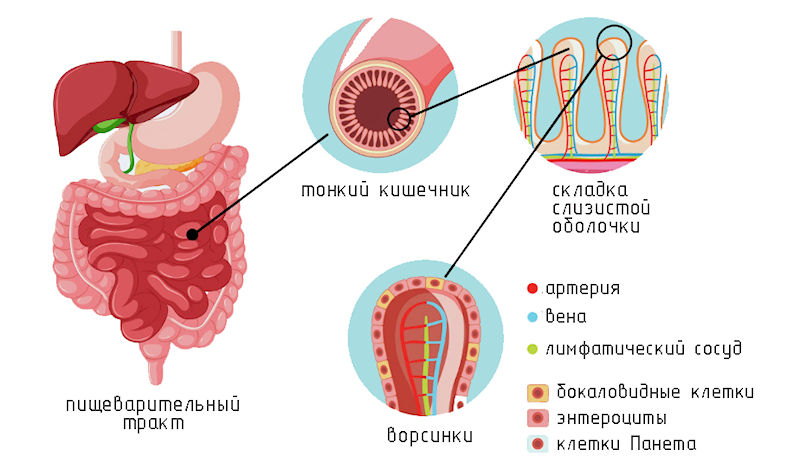 Тонкий кишечник — главная площадка для переваривания и всасывания питательных веществ. Именно здесь происходит основной гидролиз (расщепление) и всасывание большинства нутриентов. Клетки слизистой оболочки кишечника (энтероциты) на своей поверхности (щеточной кайме) содержат ферменты, которые завершают переваривание: