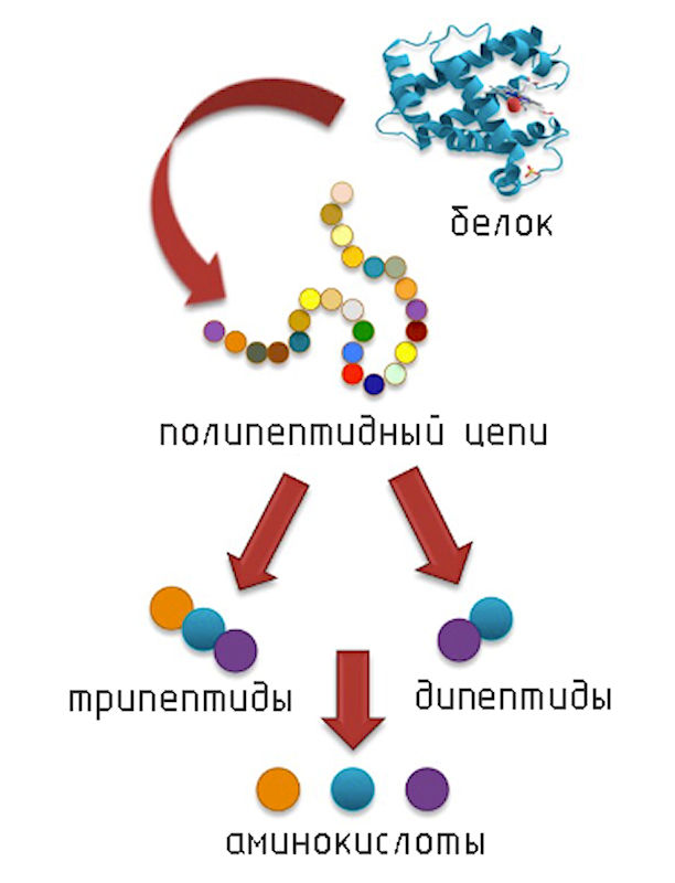- Пептидаза расщепляет короткие пептиды до аминокислот.