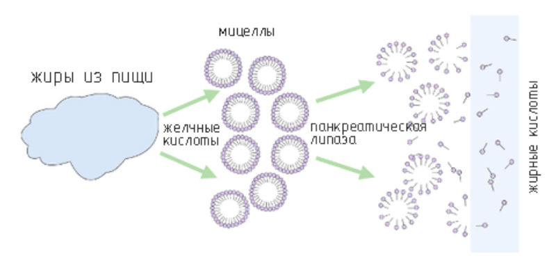 Жиры — самый сложный нутриент для усвоения. Продукты расщепления жиров (жирные кислоты, моноглицериды), а также жирорастворимые витамины (A, D, E, K) образуют с желчными кислотами смешанные мицеллы. Мицеллы подходят к мембране энтероцитов и жировые компоненты проникают внутрь клетки. Внутри энтероцита происходит ресинтез (восстановление) триглицеридов. Триглицериды, холестерин и фосфолипиды «упаковываются» в хиломикроны — крупные липопротеиновые частицы. Хиломикроны слишком велики для попадания в капилляры, поэтому они поступают в лимфатическую систему и через грудной лимфатический проток попадают в системный кровоток, минуя первоначально печень.
